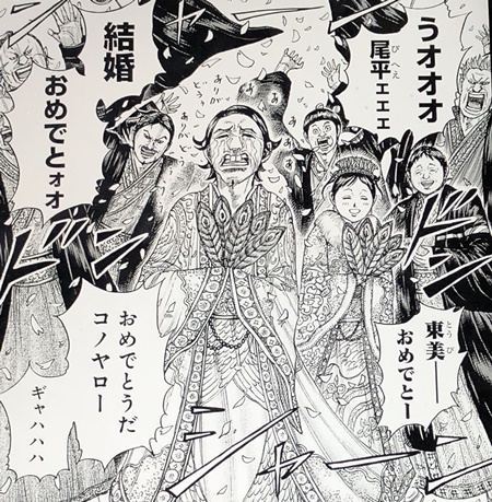 キングダム70巻・第767話「城戸村」では、尾平と東美の挙式が挙げられています。