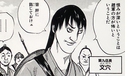 文穴の前後の伍長は魯延と松左であり、偉大な二人の飛信隊のメンバーに挟まれたのが、第九伍長の文穴だったと言えるでしょう。
