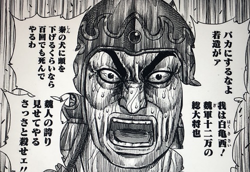 ここで桓騎は白亀西が「名前だけの総大将」だと看過しており「命乞いしろ」と命じています。