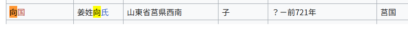 ウィキペディアにも向の単独の記事はありませんが、向国が姜姓向氏であり、国の場所が山東省莒県西南だとあります。
