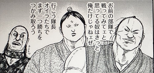 馮忌の軍に突入した時に、信は中鉄、田有、竜川、山和の四名を先頭に立てパワーでこじ開けようとしました。