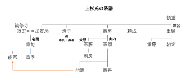 上杉能憲は上杉憲顕の子で、宅間上杉家の上杉重能の養子にもなっています。